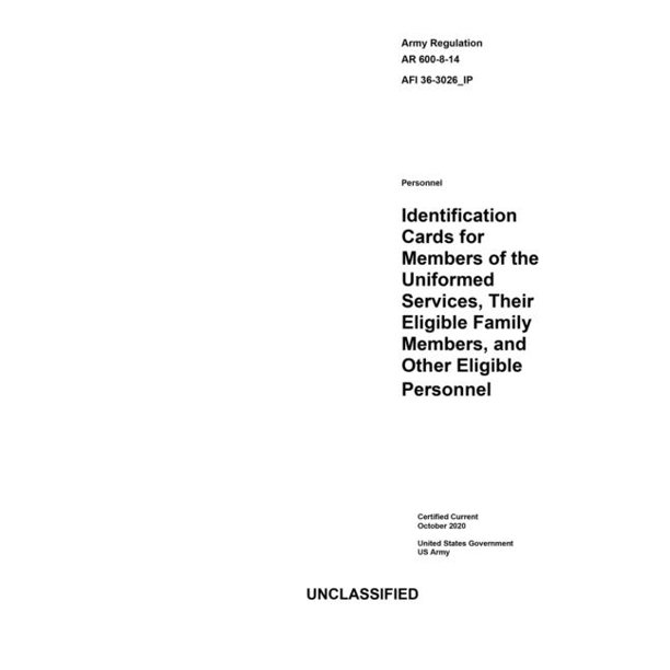 Army Regulation Ar 600 8 14 Afi 36 3026 Ip Identification Cards For Members Of The Uniformed Services Their Eligible Family Members And Other Eligible Personnel Certified Current October 2020 Paperback Walmart Com